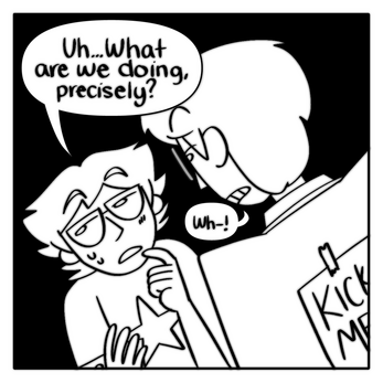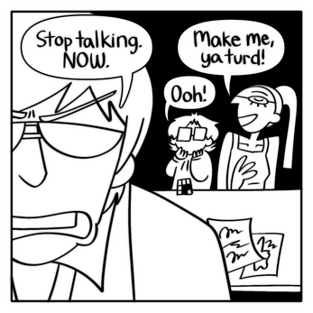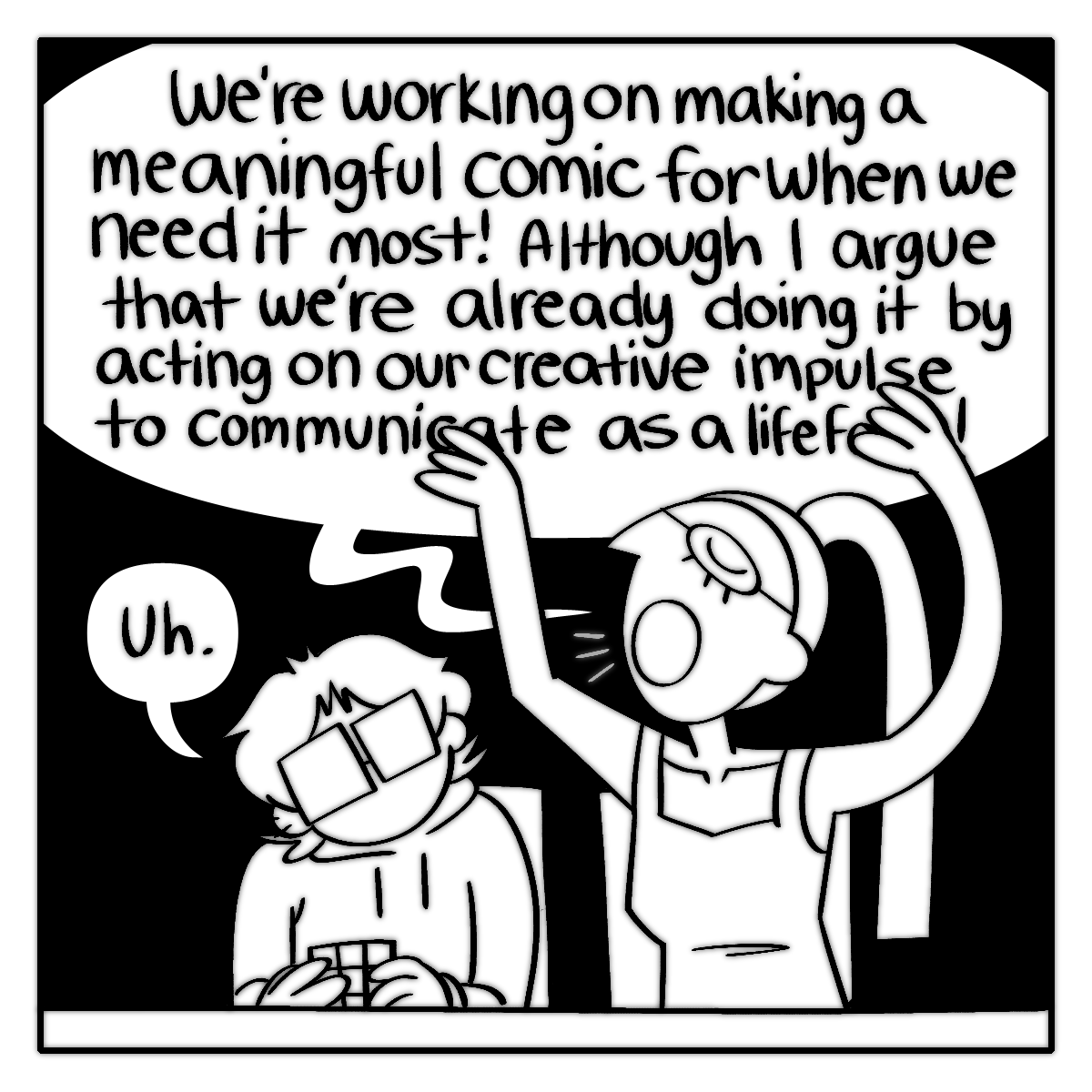 The Council is a panel-a-page autobiographical comic of me and my alternates trying to have a productive conversation to make a comic on bettering ourselves with metatextually arguable success.